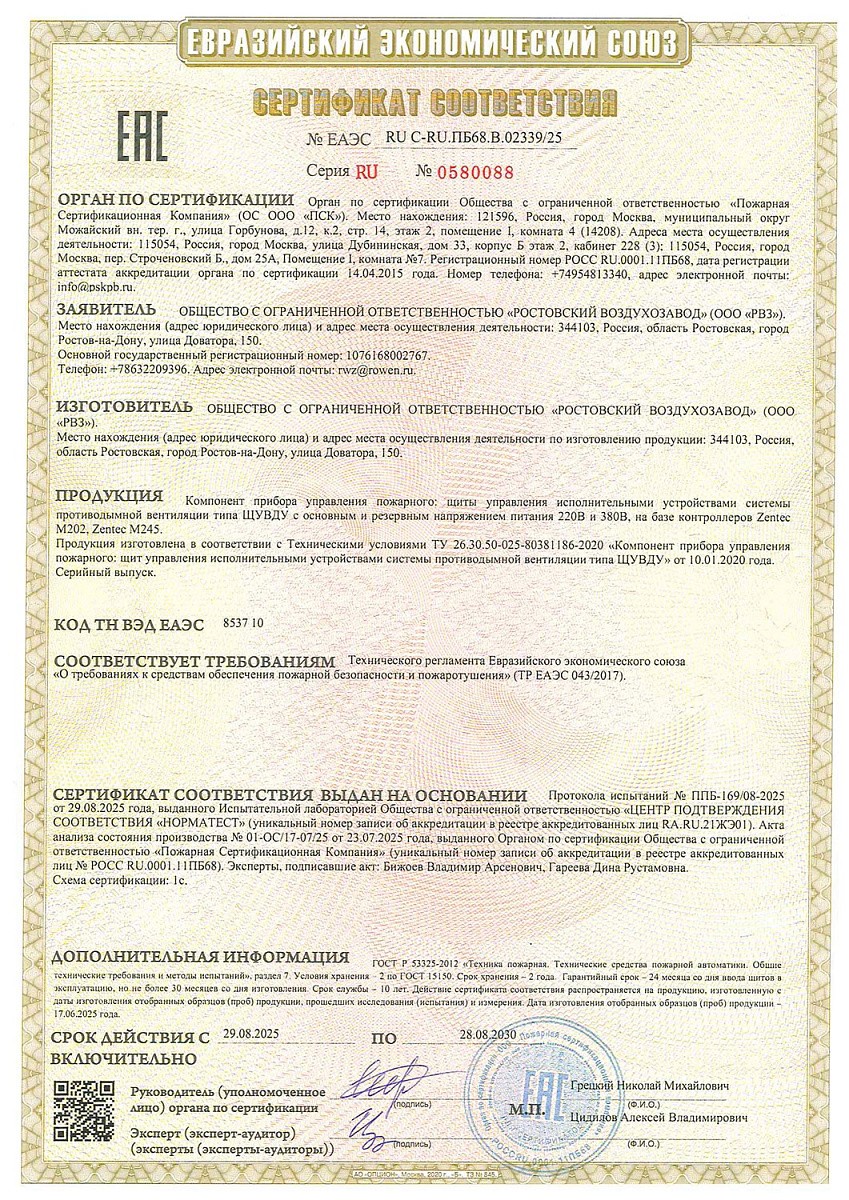 Сертификат соответствия пожарным нормам на щиты ЩУВДУ